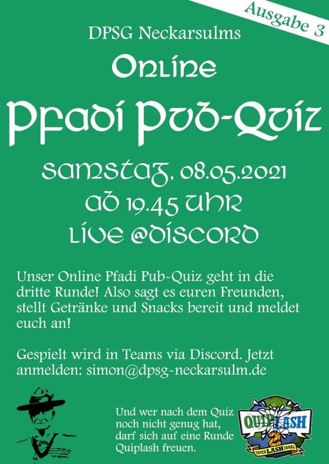 Das Online-Pub-Quiz findet am Samstag, 08.05.2021 ab 19:45 Uhr auf Discord statt. Anmeldungen bei Simon.