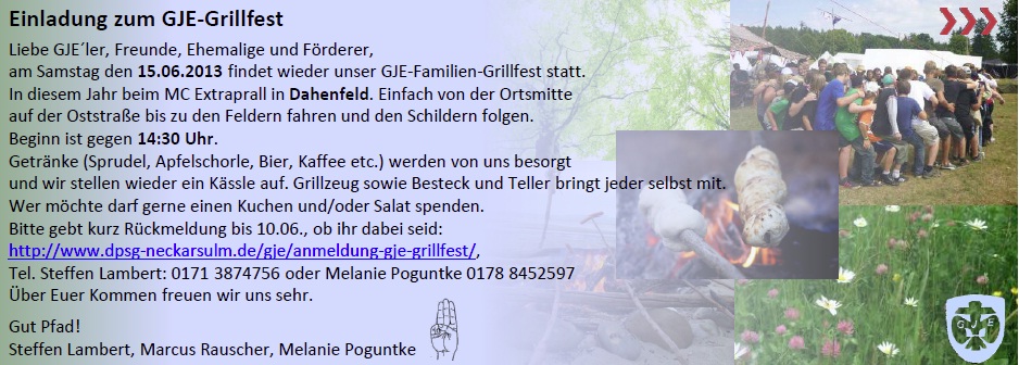 Das diesjährige GJE Grillfest findet am Samstag, 15.06.2013 beim MC Extraprall in Dahenfeld statt. Beginn ist um 14:30 Uhr. Alle GJEler, Freunde & Förderer und Aktive sind dazu recht herzlich eingeladen.